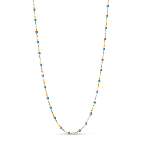 The Lola bracelet is an enchanting chain of small sky blue enamel beads. This bracelet adds a fresh and airy detail to your outfit, exuding subtle elegance. With its unique sky blue color, Lola adds a touch of lightness and can easily be combined with other jewelry to create a unique look. Please be mindful to avoid wearing our Lola style in the shower or while sleeping, and keep it away from perfumes and creams as this may affect the enamel's color and structure.
