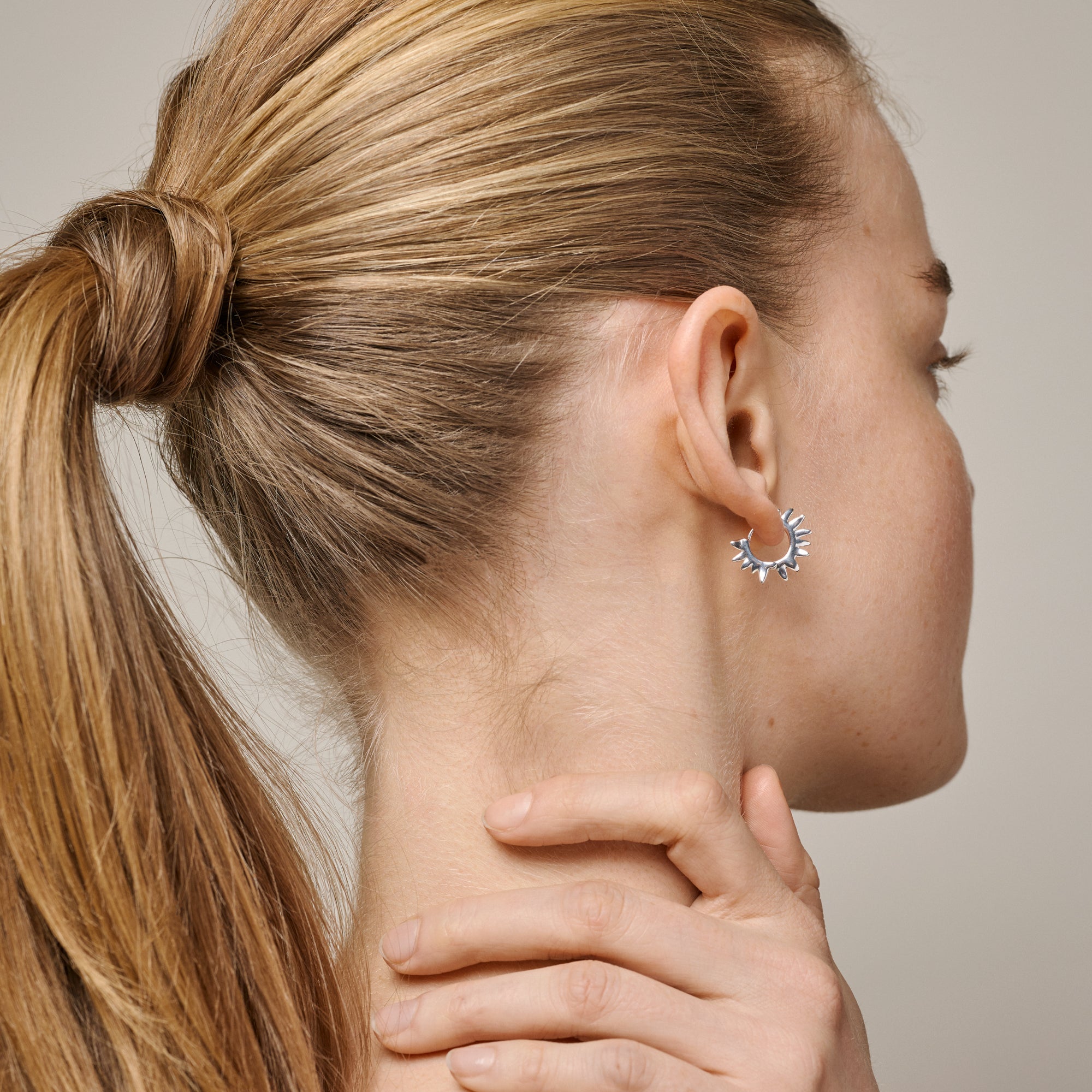 About the jewelry:Sunshine Leaves in silver is a pair of cool earrings where the design is inspired by sunflower leaves. The leaves are crafted by hand, with great attention to detail. Just like in nature, all the leaves are different. Sunshine Leaves is for those who like a slightly cooler and edgier look when it comes to jewelry and they are perfect to combine with other cool silver hoops. Also available plated with 18 karat gold.