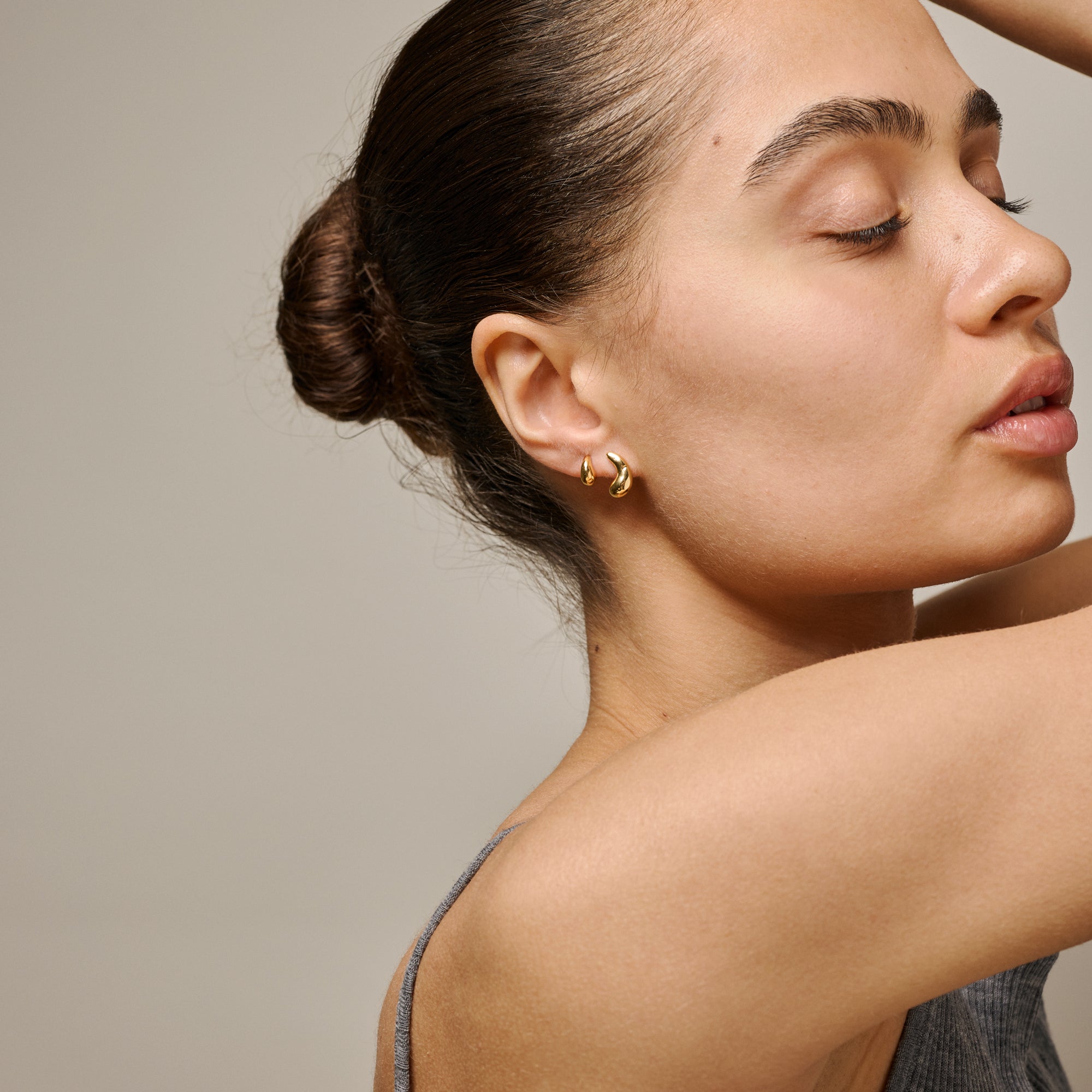 About the jewelry:Sana Stud, in gold, is an elegant ear stud with a droplet-like, organic shape. The minimalist design and shiny finish create a calm, feminine balance. Sana works beautifully on its own, but can also be mixed with other ear studs for a personal and modern styling. You can also find Sana stud in a pure silver version.