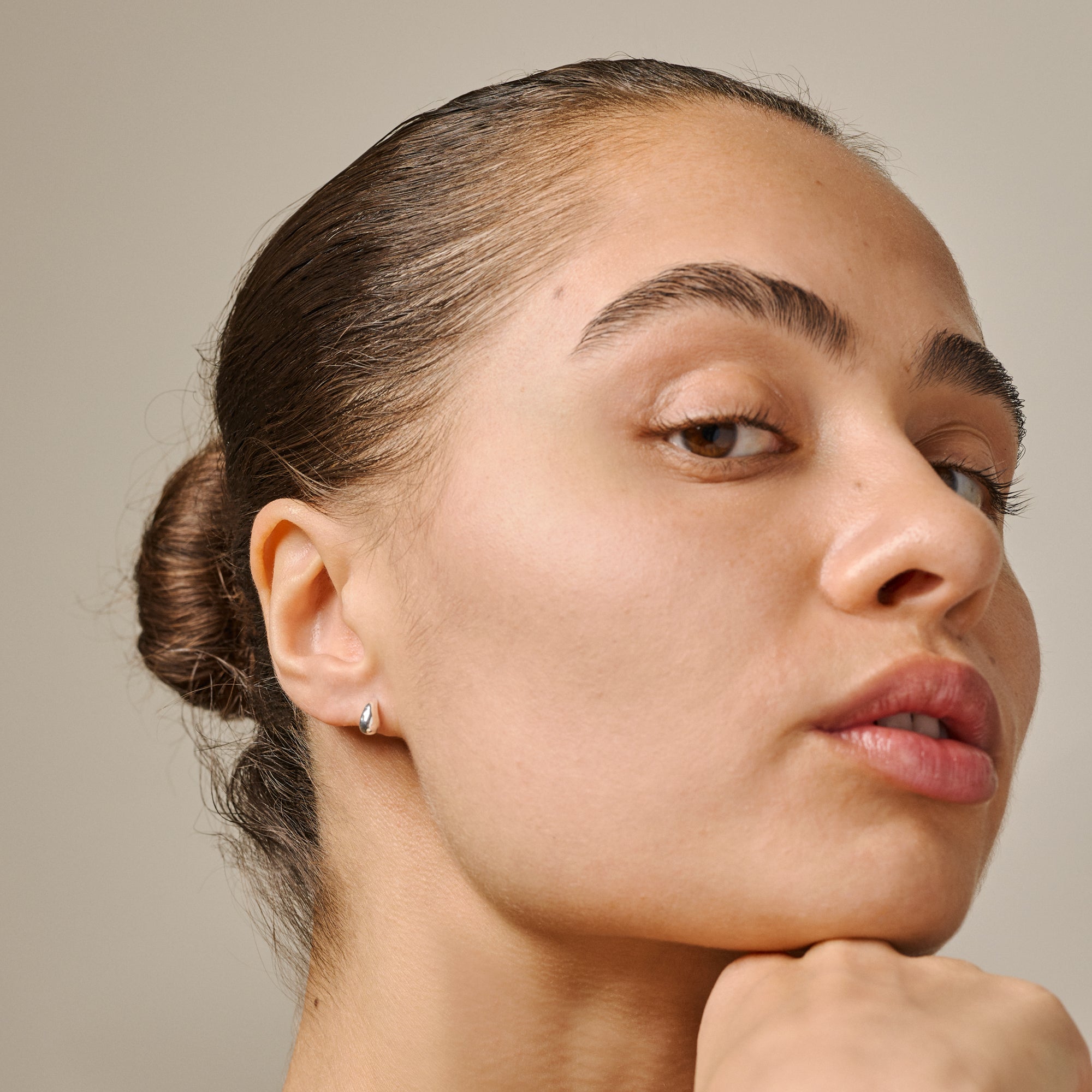 About the jewelry:Sana Stud, in silver, is an elegant ear stud with a droplet-like, organic shape. The minimalistic design and shiny finish create a calming, feminine balance. Sana looks beautiful on its own but can also be mixed with other ear studs for a personal and modern styling. Sana stud is also available plated with 18 karat gold.